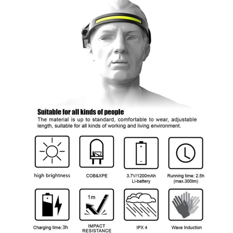 COB LED vågsensor strålkastare Ficklampa Huvudmonterad frontljus för säkerhetsvarningslampa