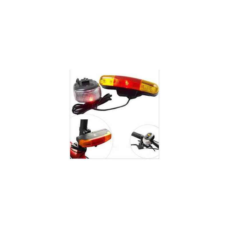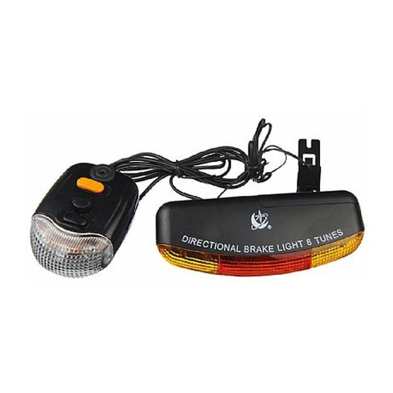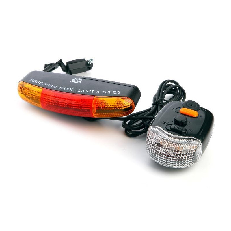 Förutom vanlig cykellampa finns det inbyggd tuta och blinkers samt bromsljus.
