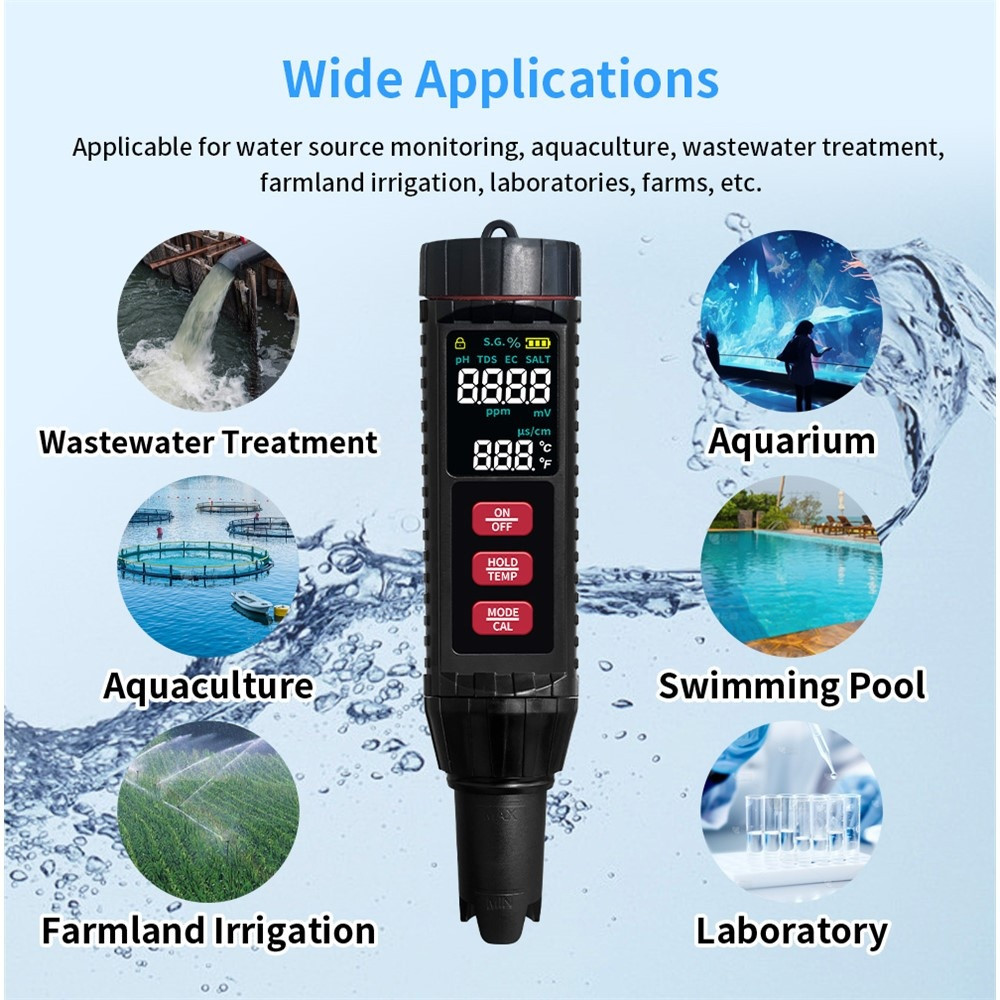 【7-i-1 multifunktionell testning】Denna bärbara enhet erbjuder högprecisionstestning för TDS, EC, temperatur, pH, salthalt, specifik vikt och ORP.