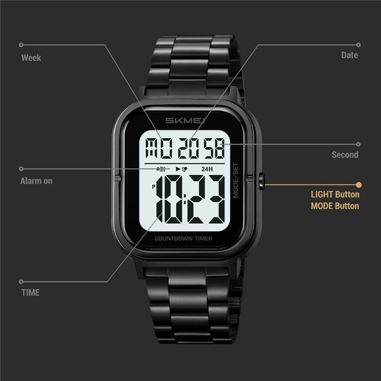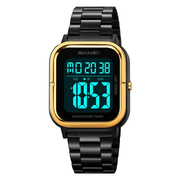 SKMEI 2316 50m Vattentät Digitalklocka Fyrkantig Elektronisk Armbandsur med EL-bakgrundsbelysning och Stoppur - Guld+Svart / Stålarmband