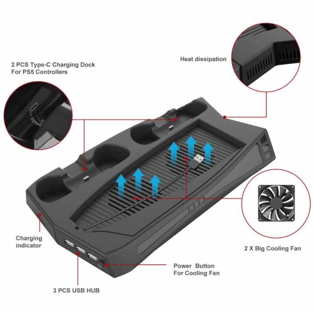 KJH-PS5-010 För Sony Playstation 5 UHD / DE Kylfläkt Design Spelkontroll Laddare Värdhållare Stativ Kontrollenhet Laddstation Designad för Sony Playstation 5 UHD/DE-värd