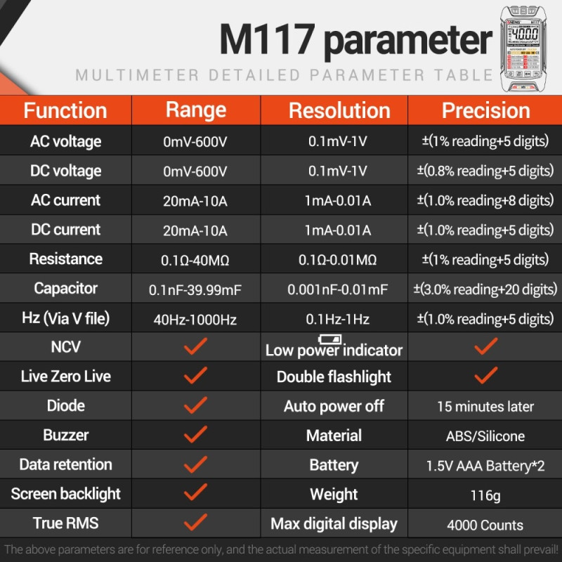ANENG M117 Multimeter Auto-Ranging Digital Tester Intelligent Multi Tester - Svart Denna multimeter är en gyllene partner för att hjälpa till att felsöka en mängd olika bil- och hushållselektriska problem säkert och exakt