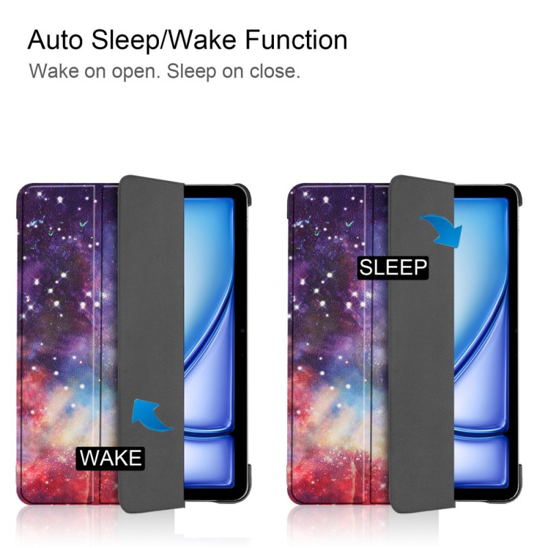 För iPad Air 11 (2024) Fodral Auto Väcka / Sova Tri-fold Ställning Tabletthölje - Galaxy Detta fodral kännetecknas av delikat PU-läder, kombinerat med ett PC-innerfodral, fin kvalitet och ett frestande utseende. Tri-fold ställningsdesign ger en lämplig vinkel för dig att läsa, skriva och titta på videor, vilket förenklar ditt arbete och liv. Mikrofiberfoder är repbeständigt och smutsavvisande och skyddar din tablets skärm.