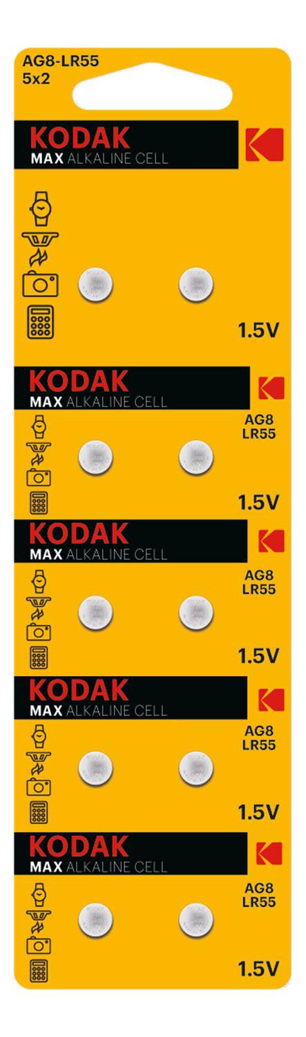 Kodak MAX AG8/LR55 mikroalkaliske knappceller (10-pakning perforert) 1.5V. Mikroalkaliknappceller brukes hovedsakelig i mindre elektroniske enheter som laserpekere, kalkulatorer, fjernkontroller, enkle klokker og leker etc.