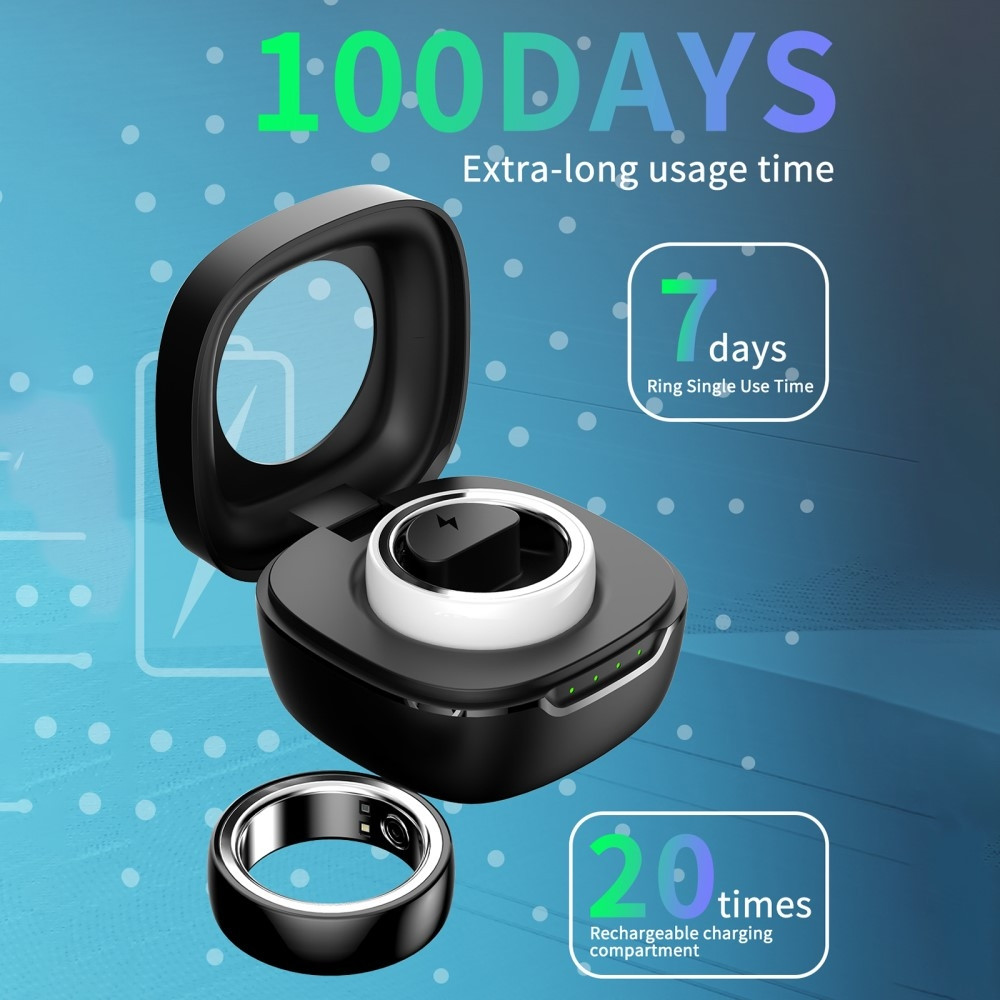 Lang batterilevetid: Med op til 7 dages arbejdstid, 60 dages standbytid og 180 dages nedlukningstid tilbyder ringen udvidet batteriydelse til uafbrudt helbredsovervågning