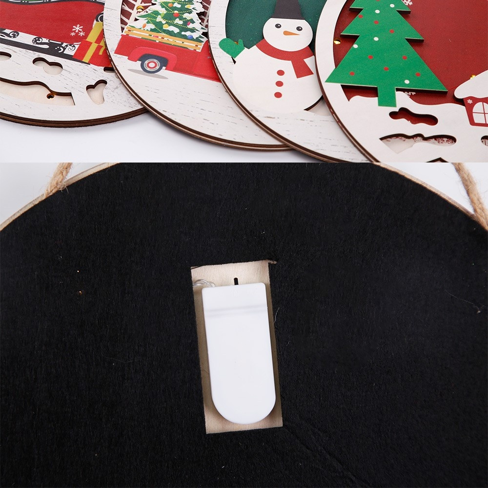Christmas Round Wooden Sign Door Decoration Xmas Hanging Ornament with LED Lights - Santa Claus and Christmas Tree This eye-catching hanging sign will attract all the attention of your neighbors and surprise your guests