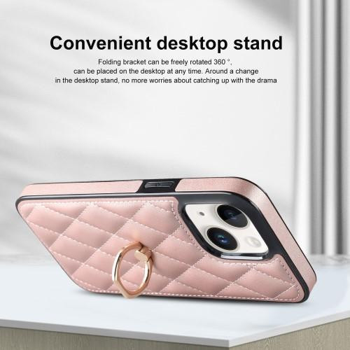 Til iPhone 14 Telefonveske PU-lær + TPU-trykt rombusrutenettmønster Bakveske med ringstativ - Rose Gold Konstru ert med termoplastisk materiale belagt med PU-lær, ripebestandig og anti-fingeravtrykk