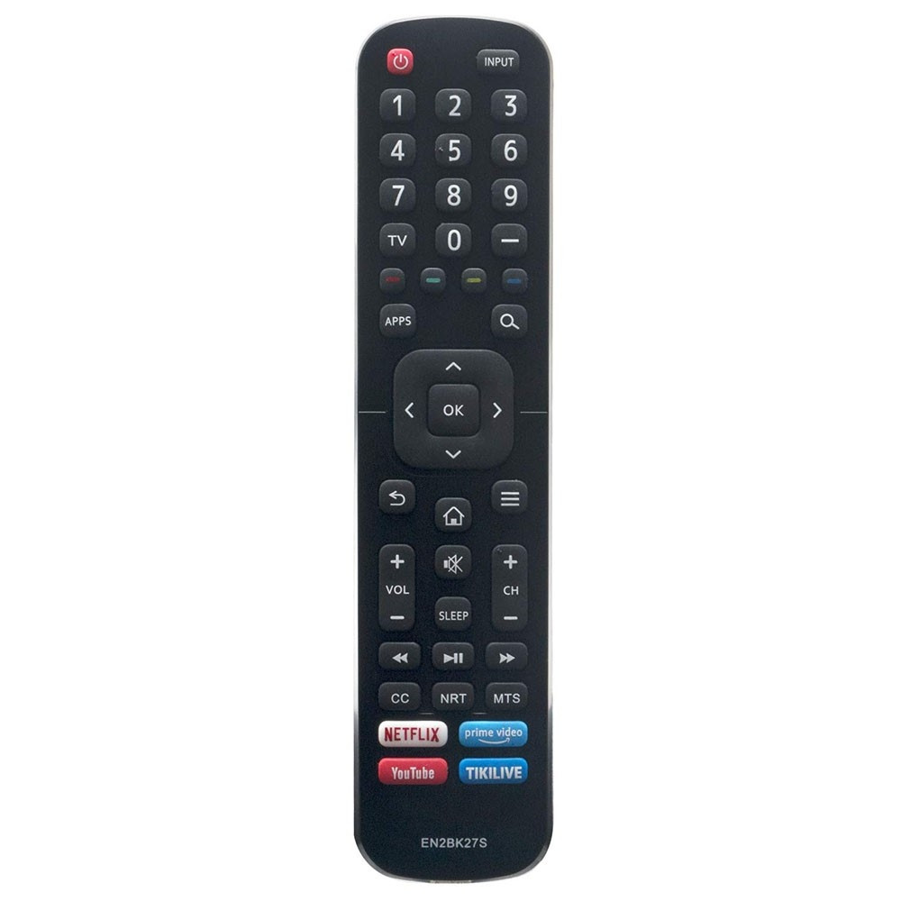 EN2BK27S fjernkontroll for Hisense TV Erstatning håndholdt fjernkontroll Bruker ABS-materiale av høy kvalitet for å sikre god ytelse Ergonomisk design, behagelig å holde i hånden Ingen behov for noe program, og det fungerer etter at batteriene er satt inn Med praktiske knapper, enkle å bruke, kommer du til kanalen du ønsker på bare noen få sekunder Et perfekt valg når fjernkontrollen må byttes Spesifikasjoner: Strømforsyning: 2* AAA-batterier ( batteri