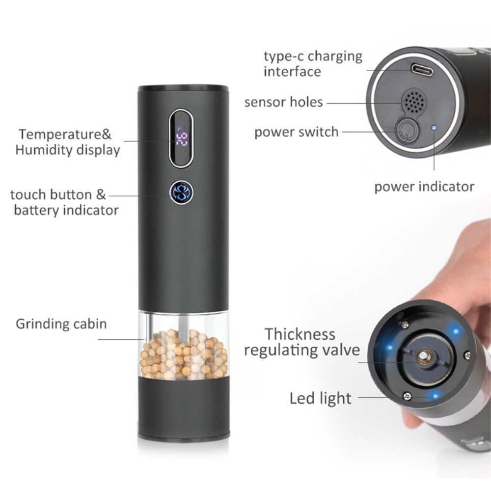 Ut@@ styrt med en ladeindikator intimt, lar den deg enkelt vite når du skal lade for kvernene Temperatur og fuktighet dobbel skjermkvern, innholdet på skjermen er tydelig synlig Spesifikasjoner: Materiale: aluminiumslegering + ABS + PC + rustfritt stål Størrelse: H167x Ø45mm Enkelt produktvekt: 220,5 g Batterikapasitet: 500 mAh Brukstid: ca. 20 minutter Ladetid: 3-4 timer Pakken inkluderer: 1 x Peppermølle 1 x USB-C ladekabel x