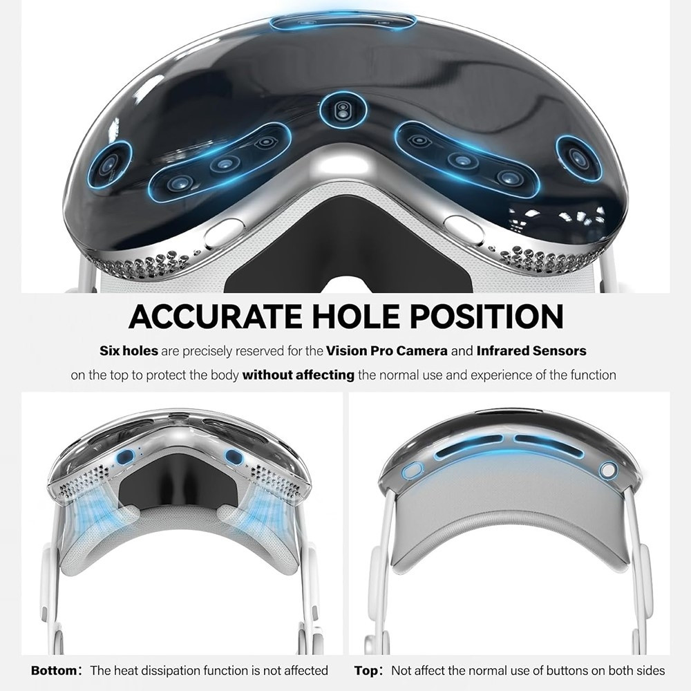 ullposisjoner: Det gjennomsiktige skallet reserverer 6 presise hullposisjoner for Vision Pros kamera og infrarøde sensor, noe som ikke vil påvirke den normale bruksopplevelsen når den brukes. Samtidig er presise hullposisjoner reservert for innløps- og utløpsradiatorer og knapper, noe som ikke vil påvirke varmespredningsfunksjonen og normal drift av knappene når de slites.