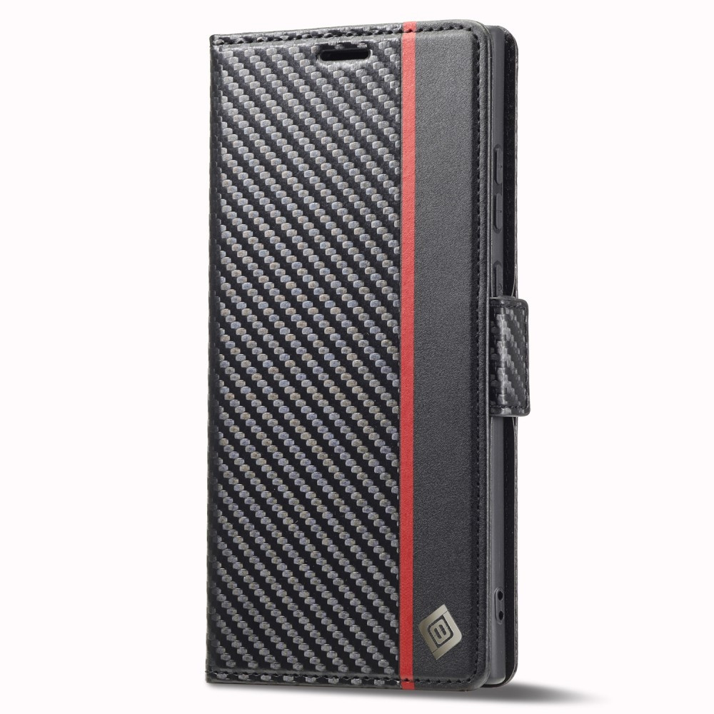 LC.IMEEKE til Samsung Galaxy S24 Ultra Carbon Fiber Texture Phone Flip-lommebok-deksel i skinn Dråpesikkert mobiltelefonveske Laget av PU-skinn+termoplastisk materiale, dekselet er tøft og holdbart. Overflaten har karbonfiberstruktur, slitesterk, støvtett og anti-fingeravtrykk. Den passer perfekt til telefonen din.