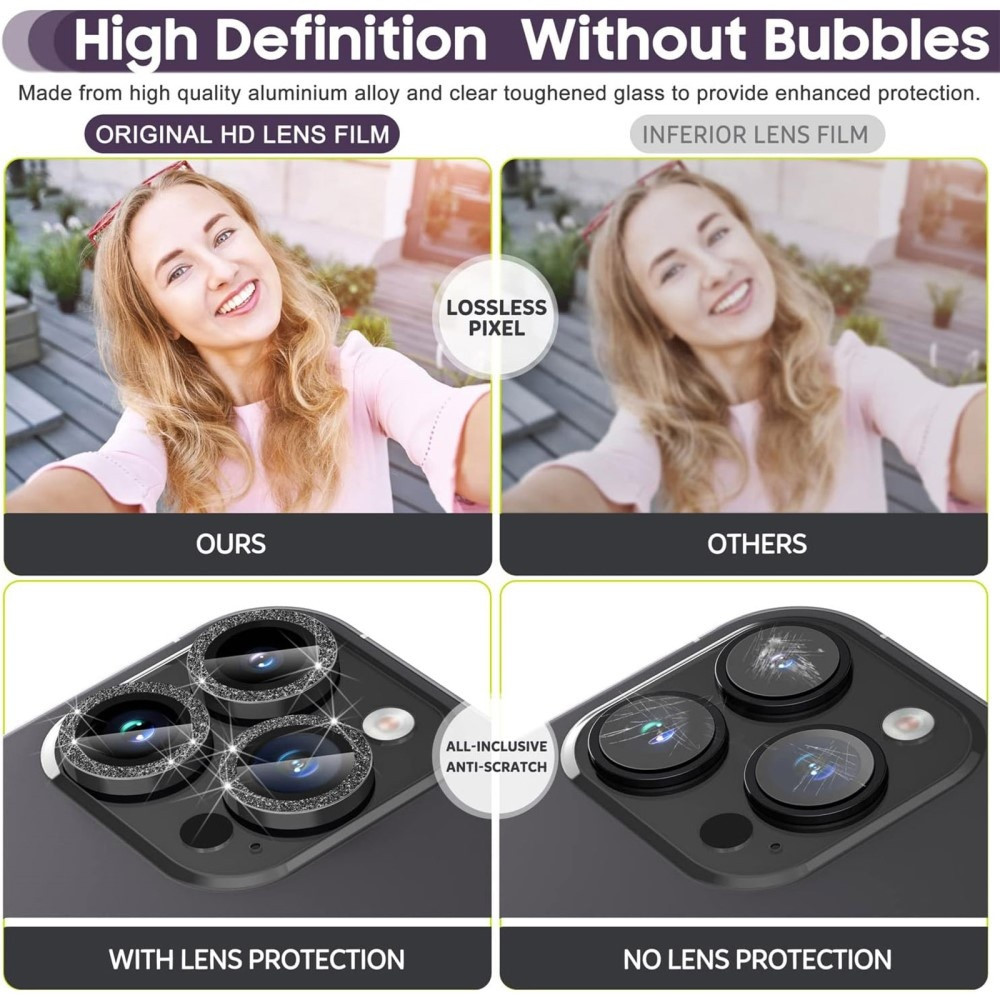 For iPhone 15 Pro/15 Pro Max Ring Circle Lens Filmsett Glitter Metall+Herdet Glass Kameralinsebeskytter L aget av høykvalitets metall+herdet glass,